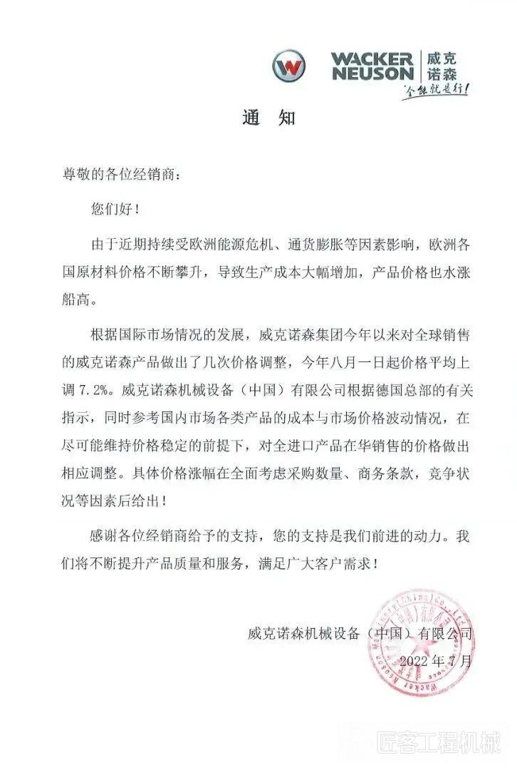 威克諾森機械設備(中國)有限公司7月28日宣布,將根據(jù)德國總部的有關(guān)指示,同時參考國內(nèi)市場各類產(chǎn)品的成本與市場價格波動情況,在盡可能維持價格穩(wěn)定的前提下,上調(diào)全進口產(chǎn)品在華銷售價格,具體價格漲幅將在全面考慮采購數(shù)量、商務條款和競爭狀況等因素后給出。